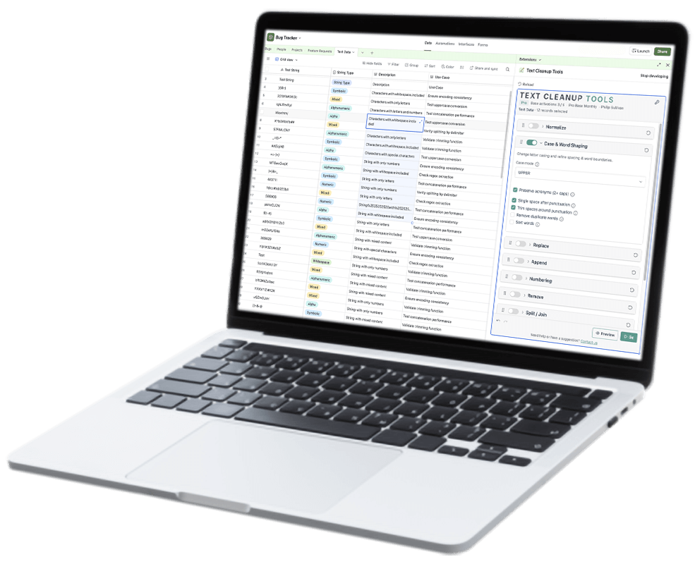 Spreadsheet teams have had text cleanup utilities for years. Text Cleanup Tools brings that workflow into Airtable so you can clean imported strings, standardize naming, and normalize text directly where your team already works.